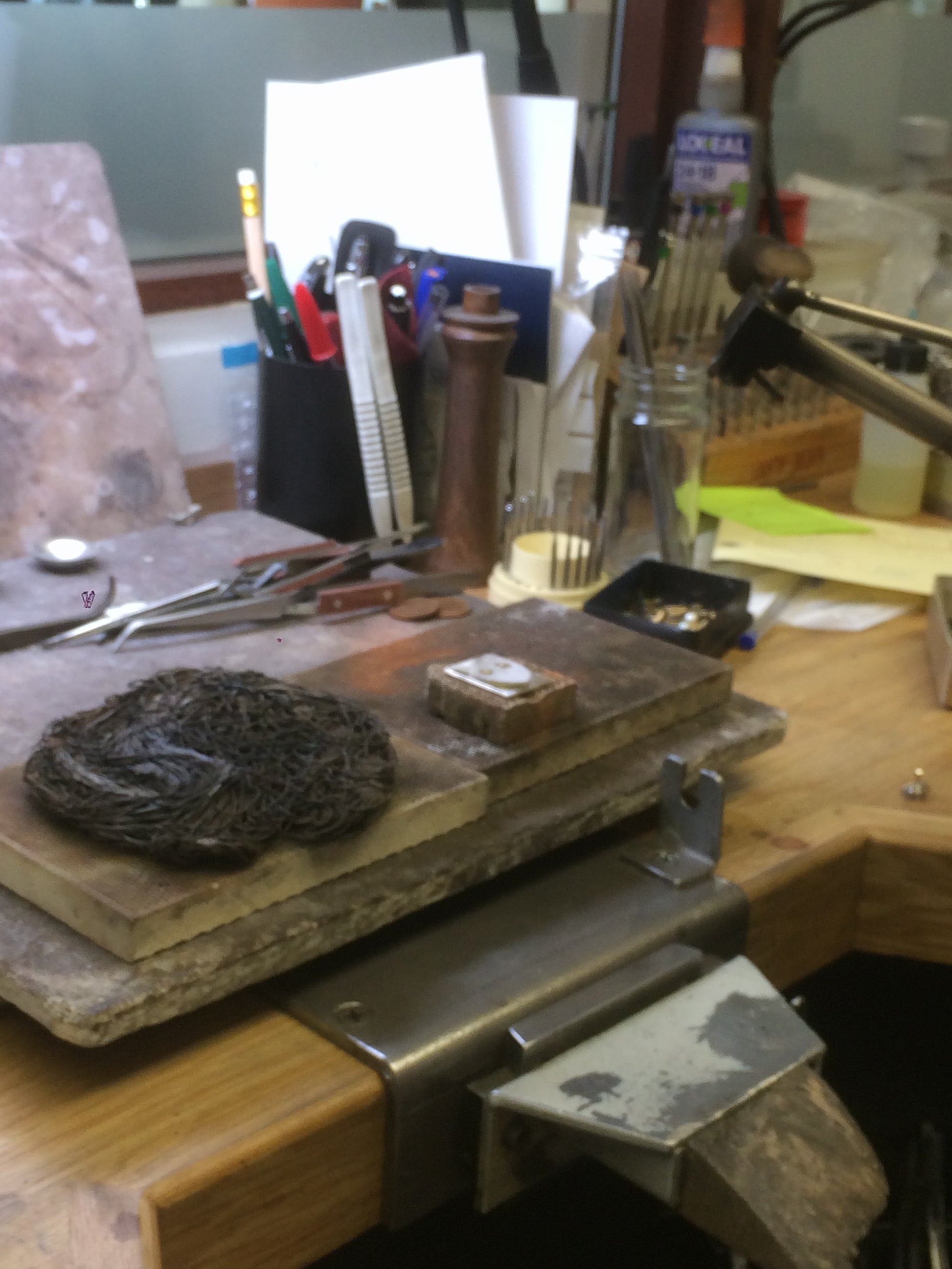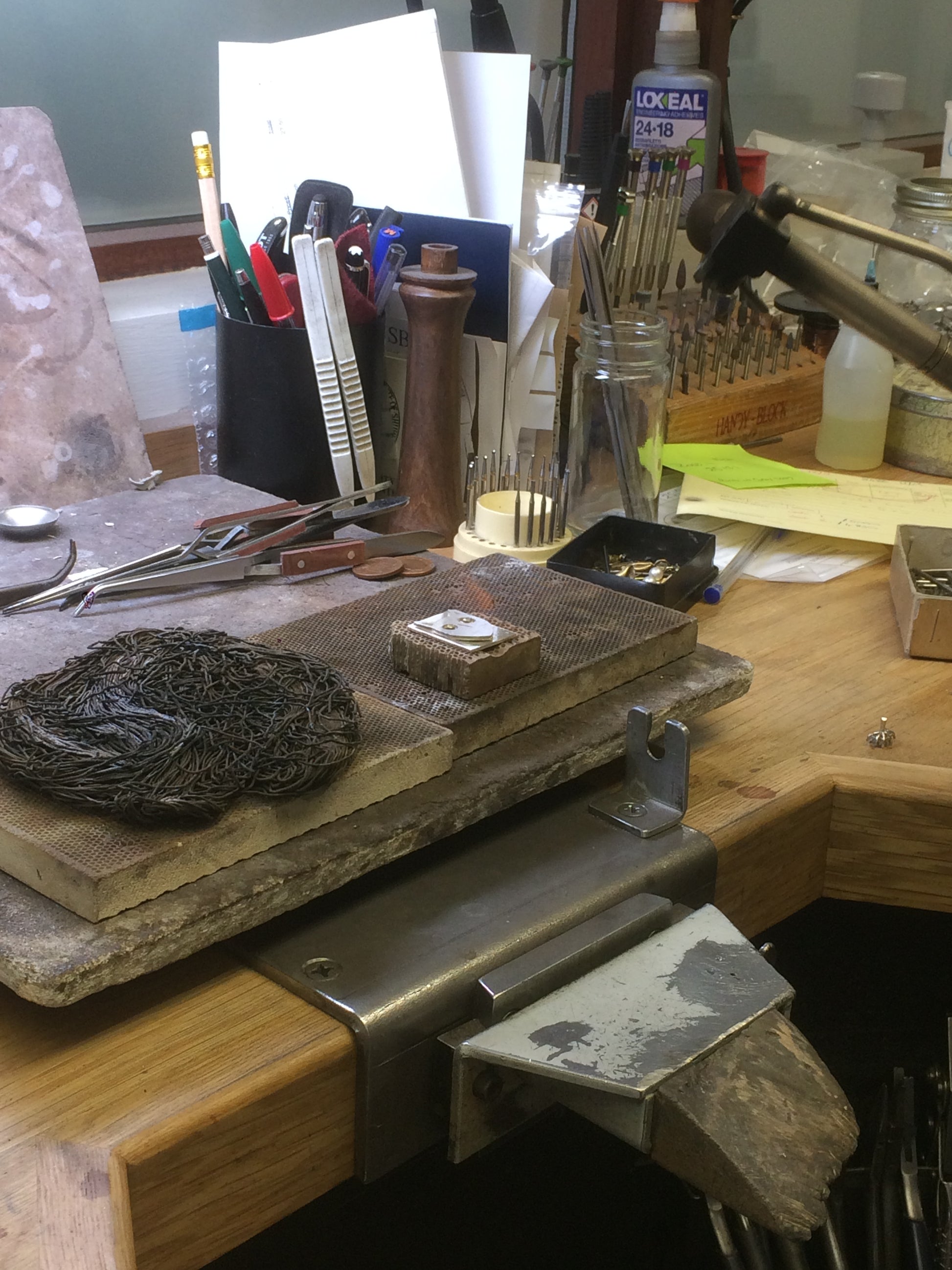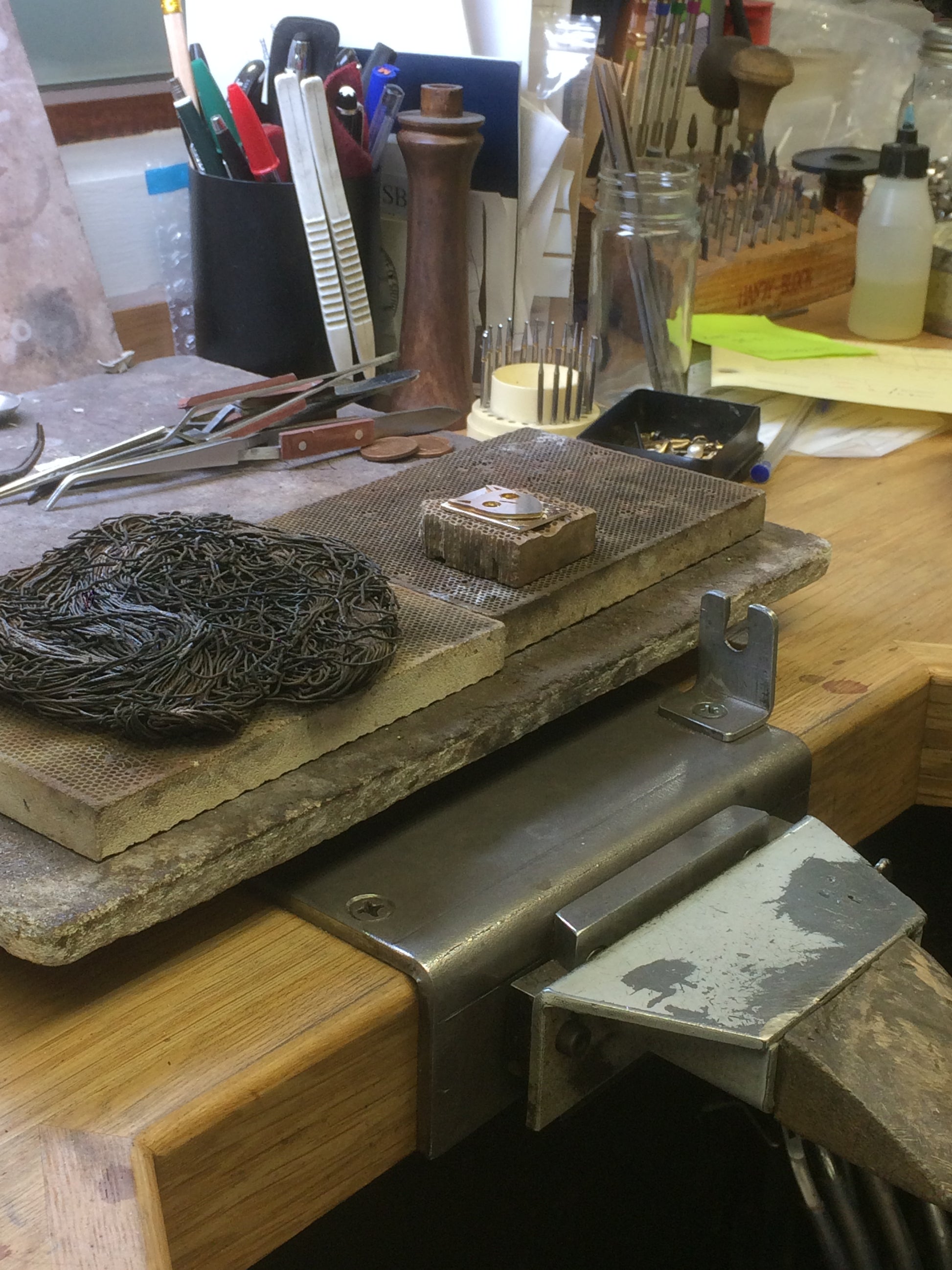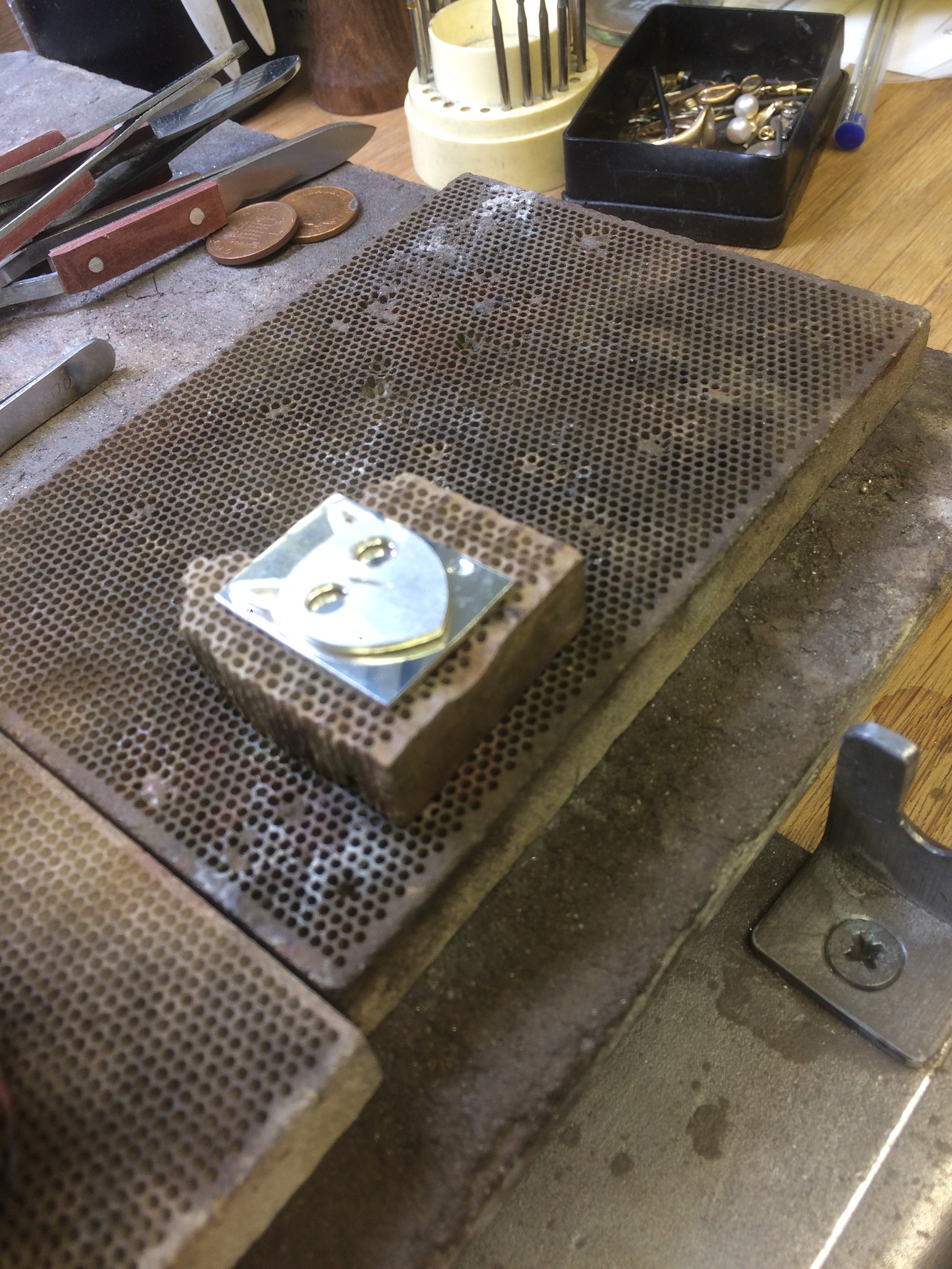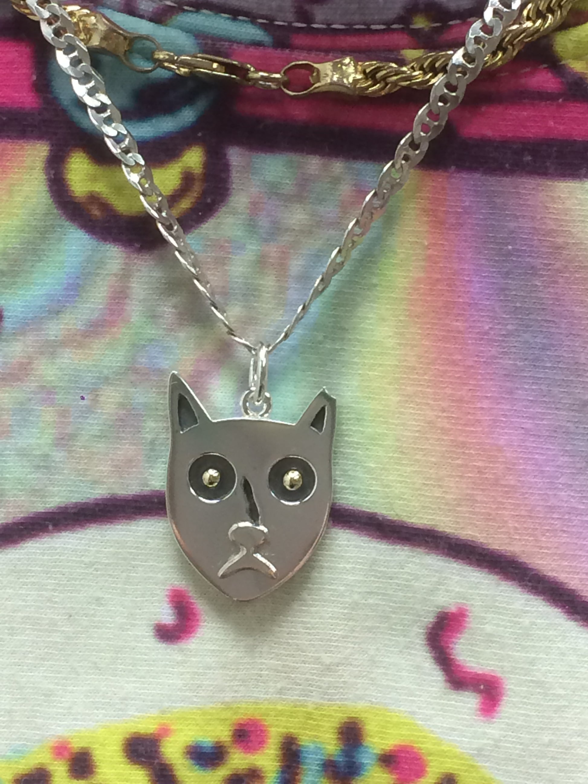 Handcrafted sterling silver cats face with 9ct gold eye features.